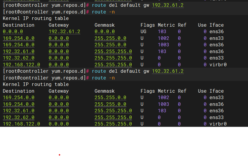 可见当前是以ens36,即仅主机网关默认,无法ping外网,所以我们要删除,然后使用ens33 nat的网关网络
