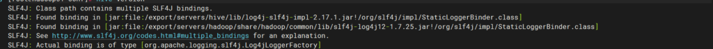hadoop和hive包的slf4j产生了冲突,当多个不同的 SLF4J 绑定同时存在于类路径中时,SLF4J 不知道应该使用哪个具体的日志实现。