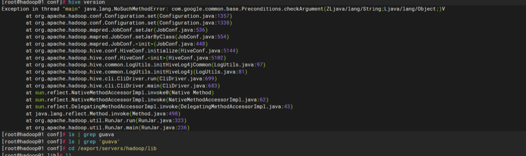 [root@hadoop01 lib]# cp /export/servers/hadoop/share/hadoop/common/lib/guava-27.0-jre.jar /export/servers/hive/lib/