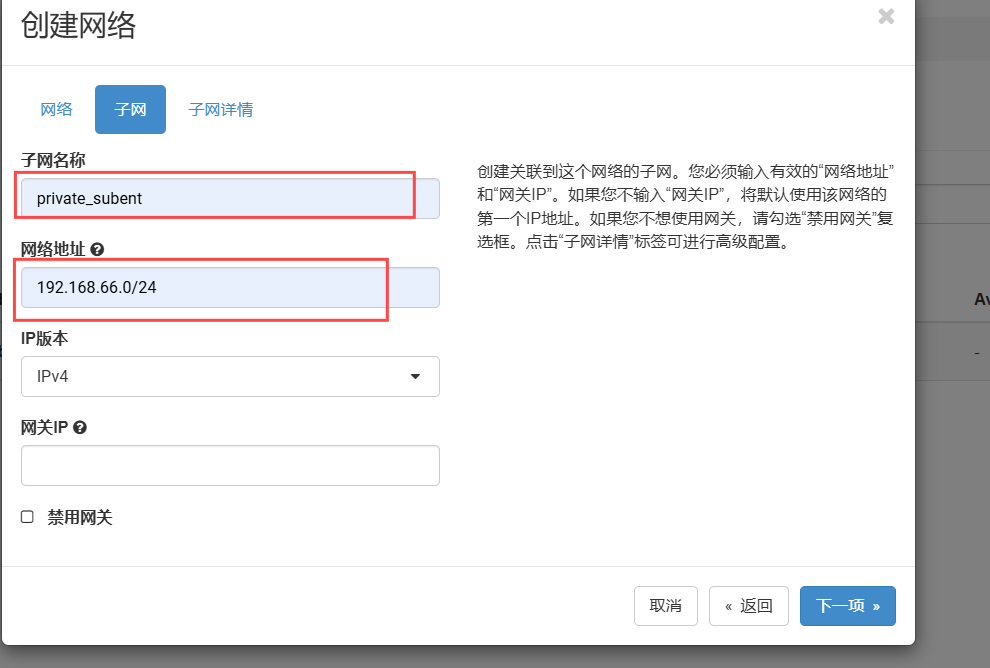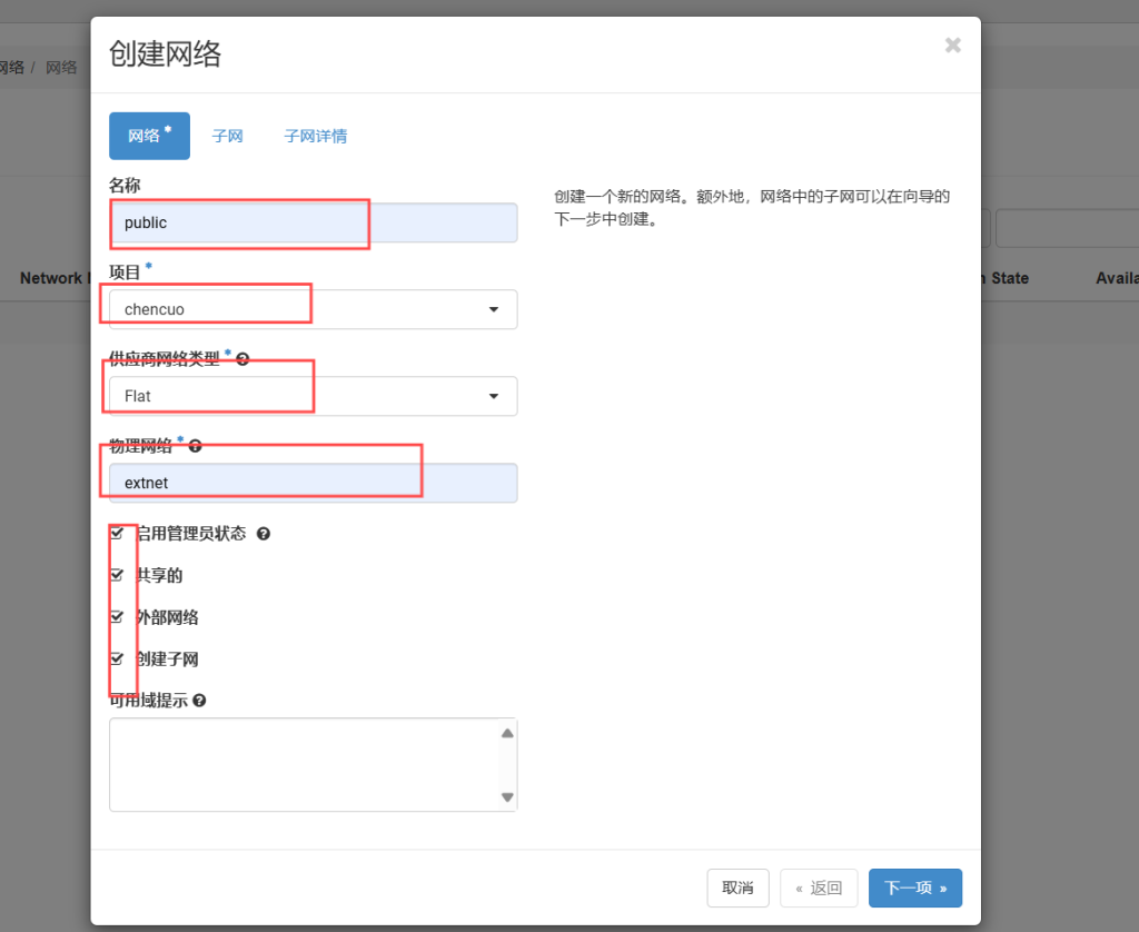 名称固定public,项目为你创建的,供应商为flat固定,物理网络为你自己设置的,四个全勾,点击下一项