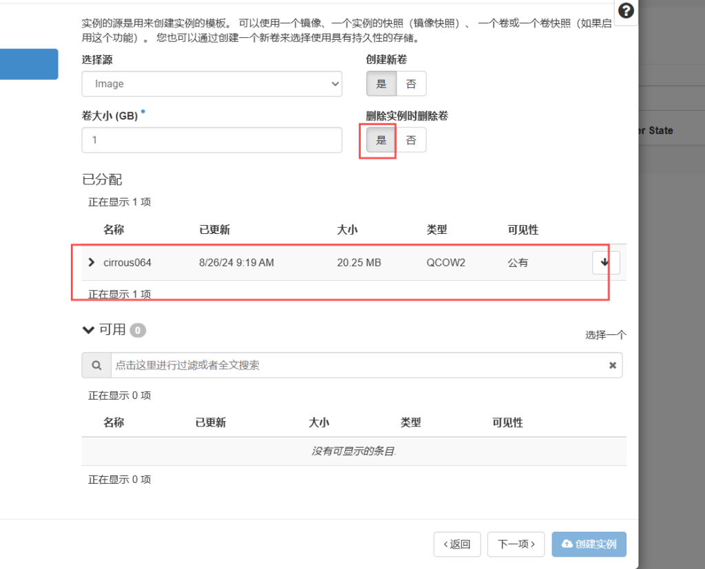 选择上传的镜像,删除实例时删除卷选择是