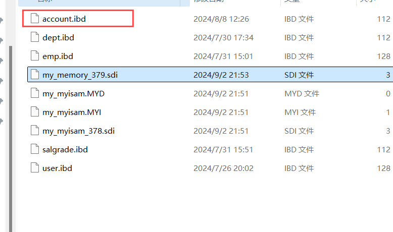 可以看到里面有很多的ibd文件,每一个ibd文件就对应一张表,比如:我们有一张表 account,就有这样的一个account.ibd文件,而在这个ibd文件中不仅存放表结构、数据,还会存放该表对应的索引信息。 而该文件是基于二进制存储的,不能直接基于记事本打开,我们可以使用mysql提供的一个指令 ibd2sdi ,通过该指令就可以从ibd文件中提取sdi信息,而sdi数据字典信息中就包含该表