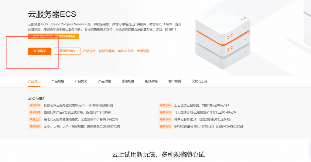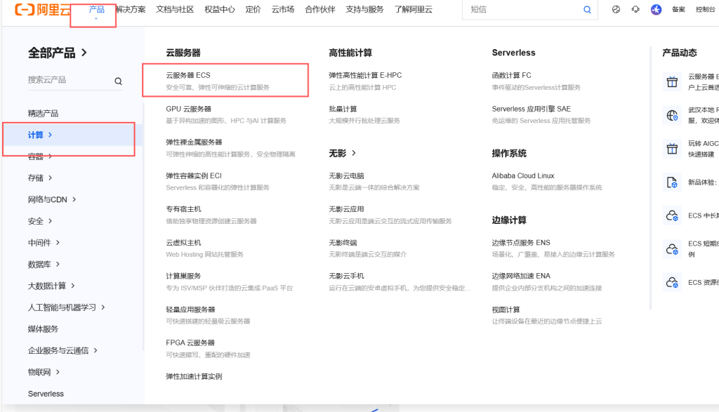进入阿里云,选择产品——计算——云服务器ECS