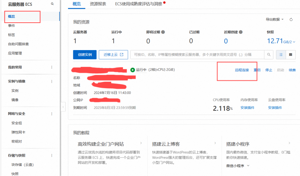 进入后台,点击概览——远程连接,根据你的账号密码登录到实例,若你使用的不是阿里云,则需要使用远程连接工具进入。