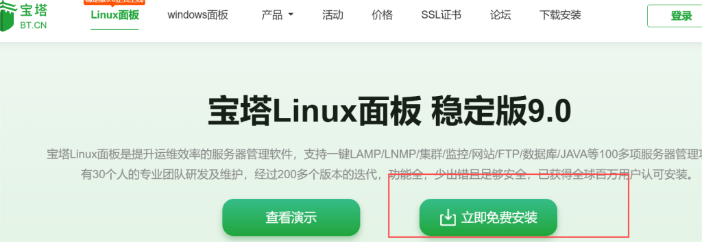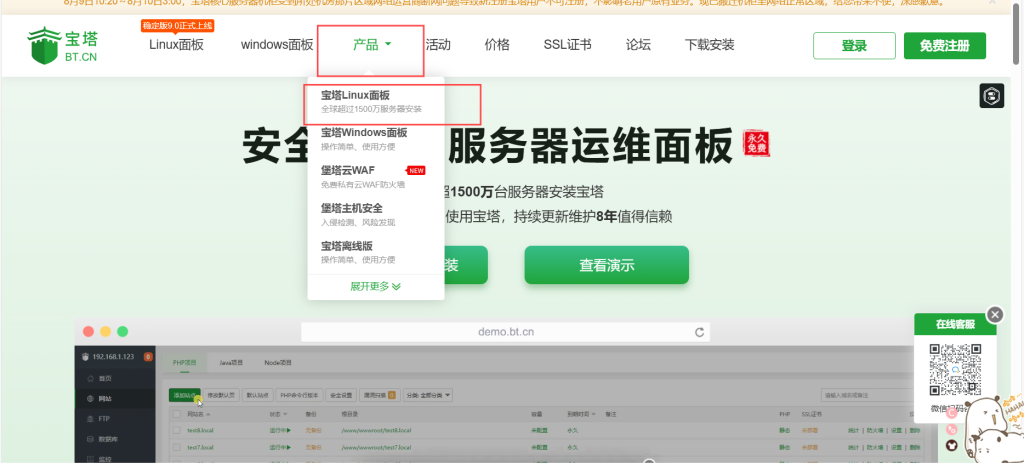 点击导航栏的产品——宝塔linux面板