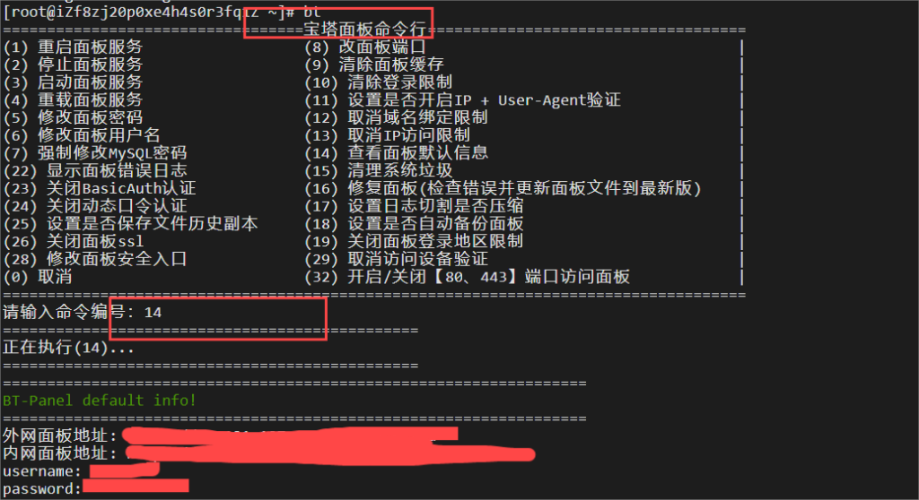 等待安装完,会弹出两个链接,内外网面板地址,外网面板就是你要使用的。