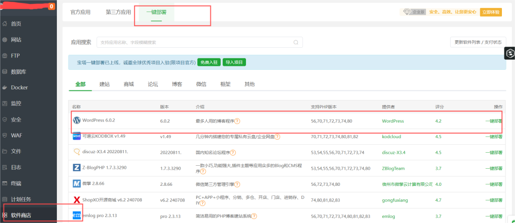 安装好套件后,选择软件商店,选择一键部署,选择WordPress,这里建议PHP版本为80,若不是80可以自行升级或者下载。