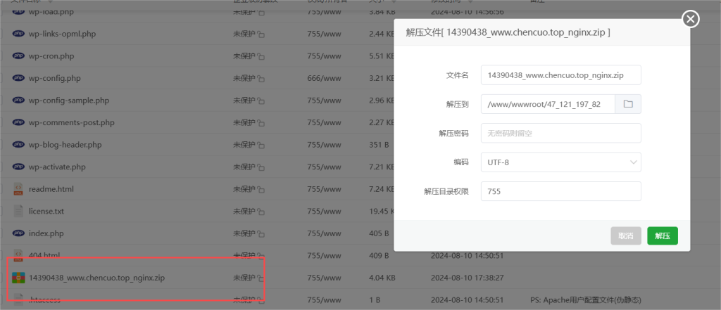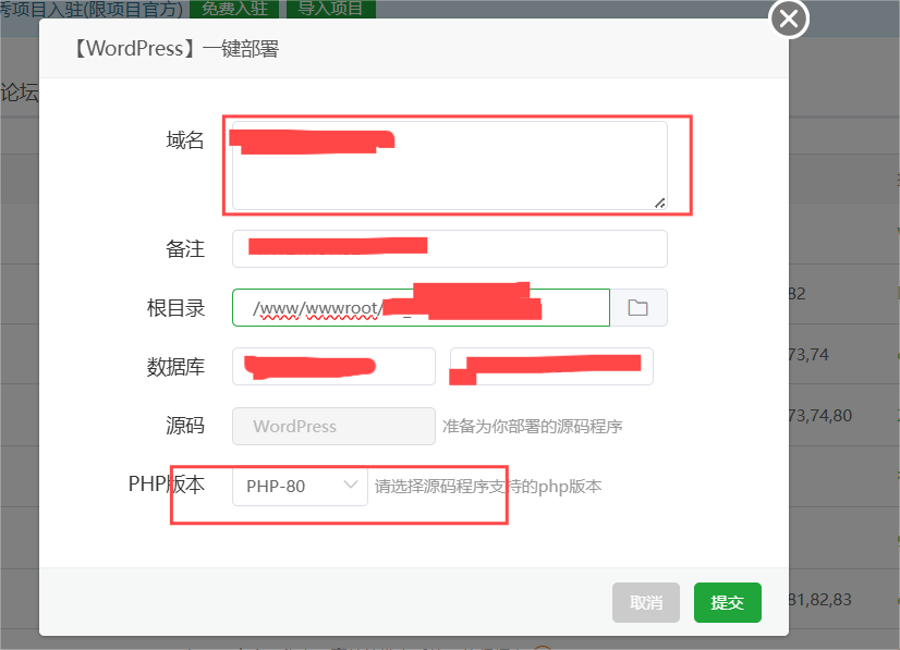 域名输入你实例的公网ip,备注和根目录,数据库不更改,PHP版本选择你有的版本,优先80版本