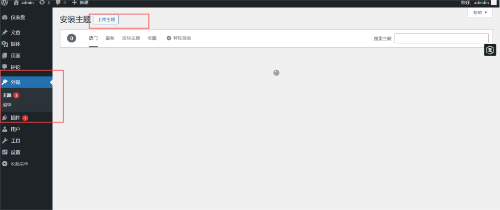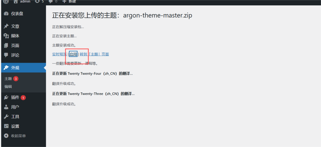 回到WordPress网站,点击外观——主题——安装主题——上传主题——立即安装,源argon包不需要解压上传即可。