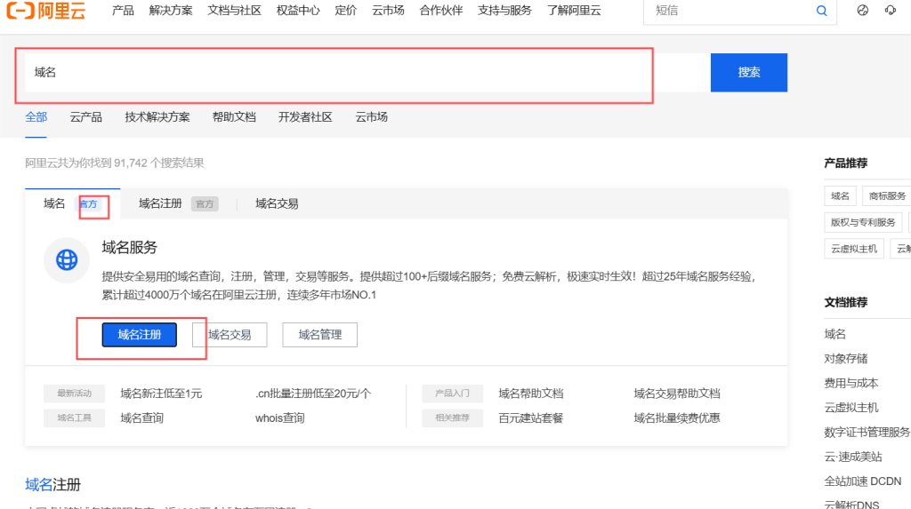 回到阿里云,搜索栏搜索 ‘域名’ 选择官方的域名服务——域名注册