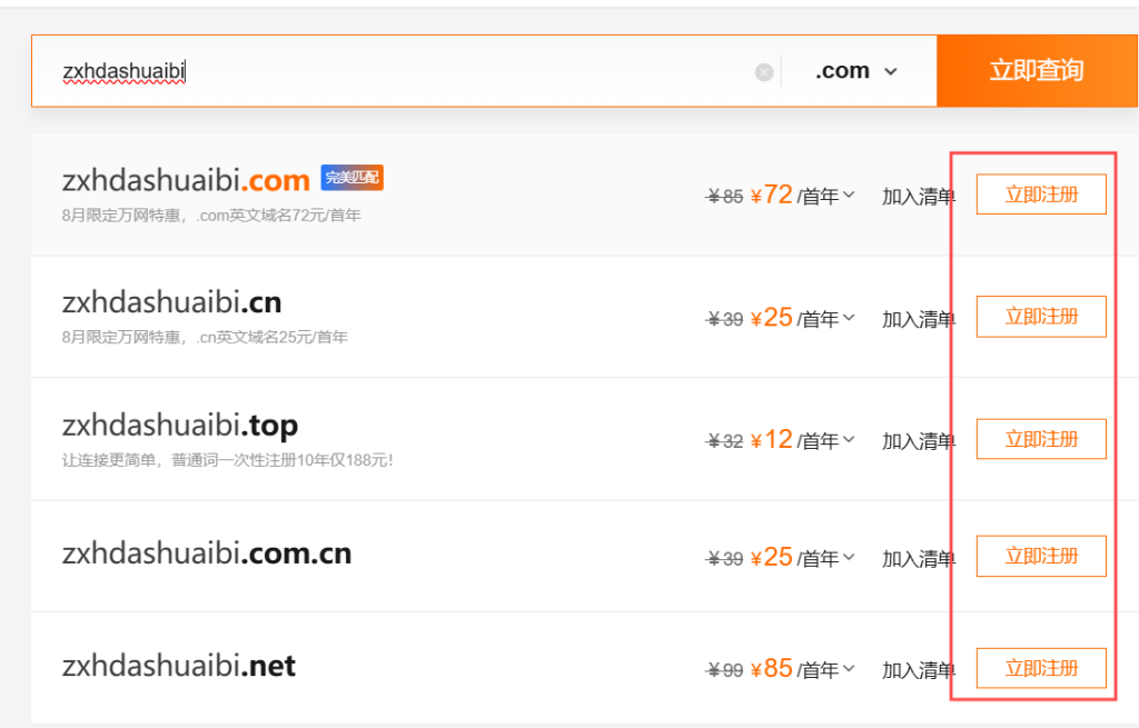 选择你喜欢的后缀,点击立即注册,进入付款页面,付款,注册成功。