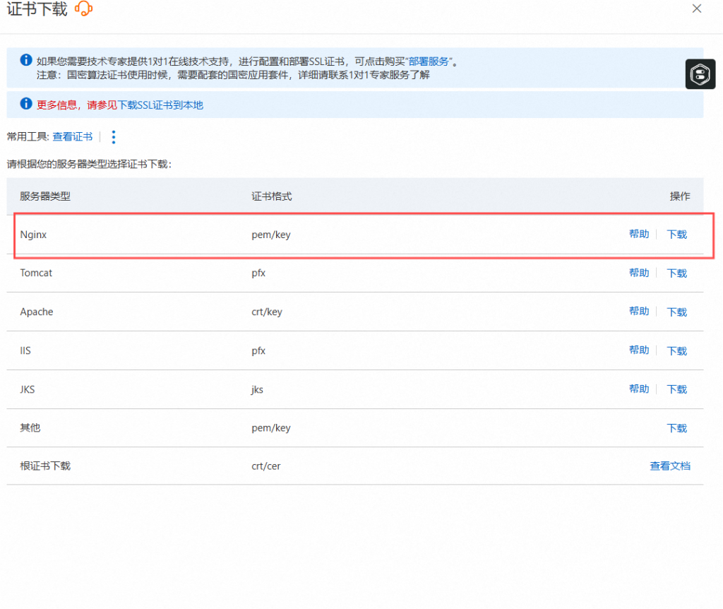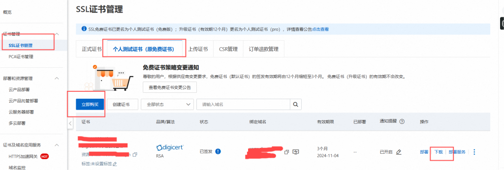 购买后查看状态,查看提示做好部署,然后等待证书签发,签发完成后,点击下载。