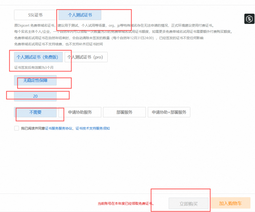 阿里云主页搜索:数字证书管理服务管理控制平台——证书管理——ssl证书——个人测试证书——立即购买