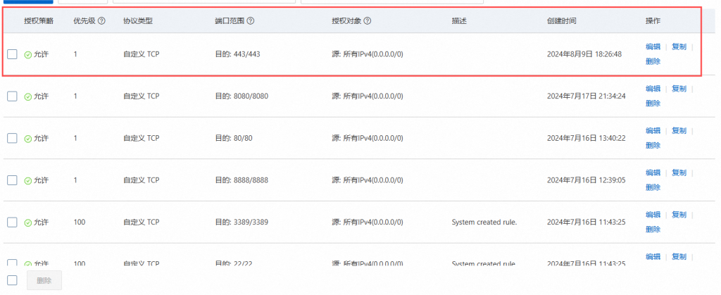 回到阿里云实例后台,选择安全组,管理规则,添加443规则