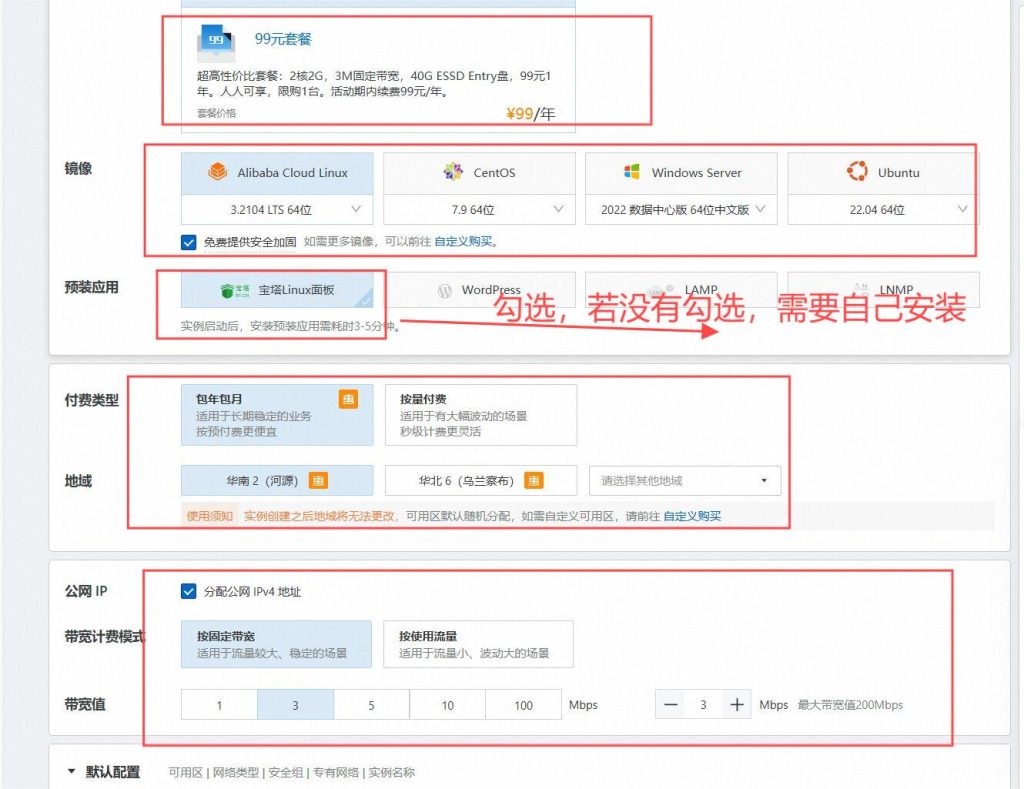 选择快速购买,选择99元套餐,对于博客建站这个大小合适了,可以都按照我的选择来,预装应用选择宝塔linux面板,若没有选择,需要自己下载。