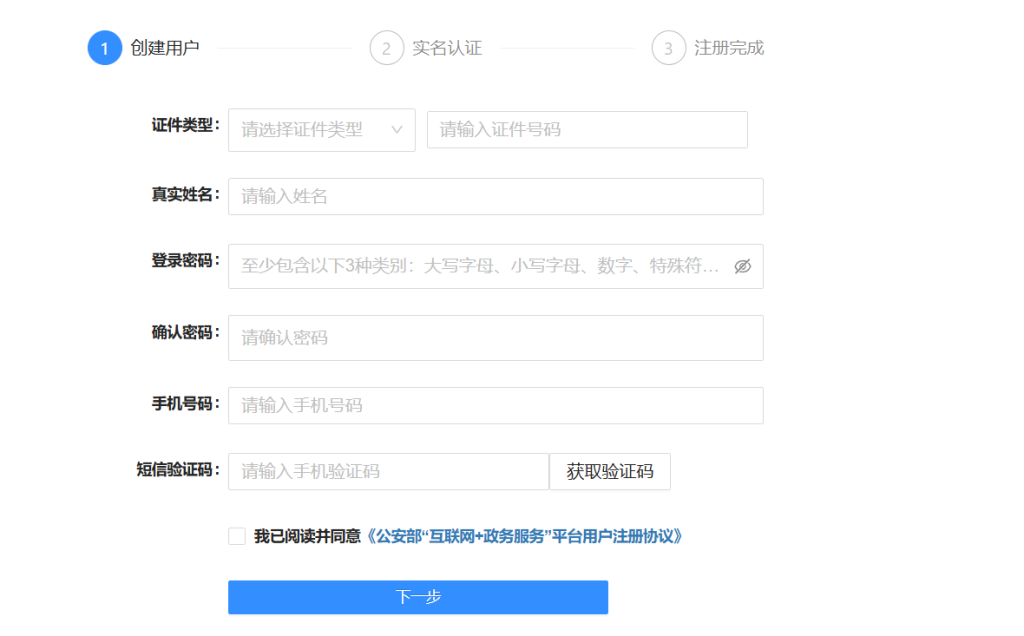 按照个人实际情况来填写,实名认证需要下载 ‘公安——一网办通’ app,到第二部会有相应链接,由于是国家相关安全部门,账号信息验证频繁,请勿介意。
