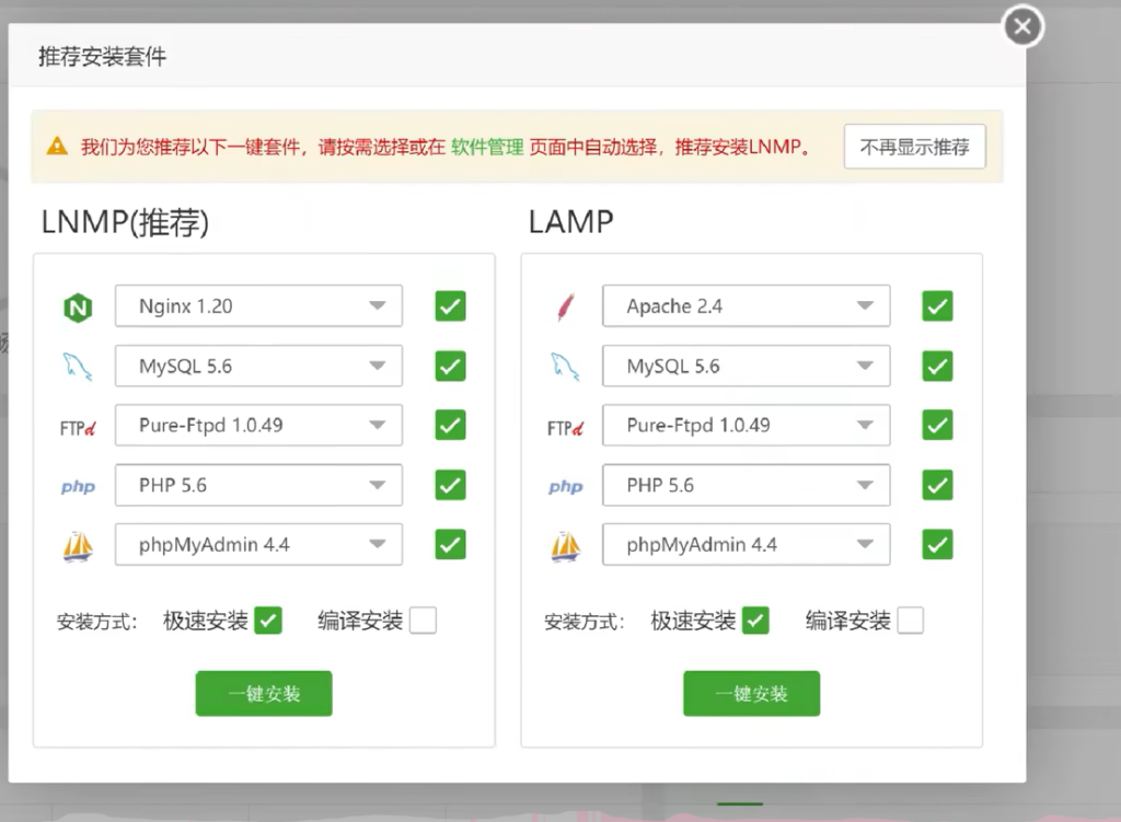 当你首次进入宝塔面板后,会弹出框架安装,选择推荐的安装(图片经供参考),大约10分钟左右。