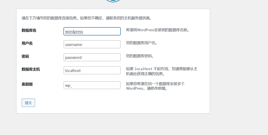 根据刚才弹出站点框网站信息,填写数据库名,用户和密码。主机和表前缀不用更改(原始图,仅供参考)