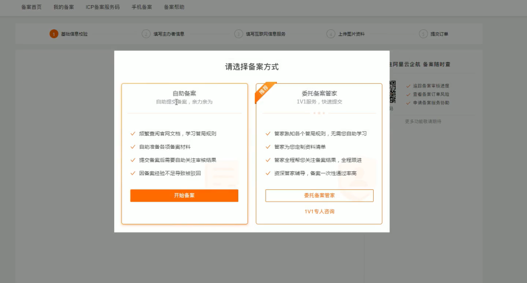 阿里云主页,点击备案,若是首次备案,则会弹出首次备案。