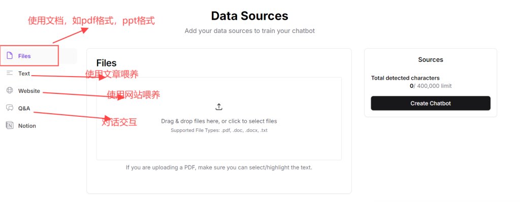 登录后跳转主页面,点击 ‘New create’,进入人工智能训练页面,根据你的目的,提供相关的资料来培训人工智能,chatbase提供了多种方式,如图
