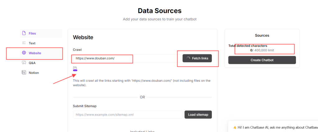此处博主展示使用网页资源训练ai,点击website——url框内输入链接——点击fetch links,等待进度条满,使用下面方式也可以,此处以豆瓣官网为例,请注意,你所给的训练素材不要超过右边的最大限制limit,也不要超过10条链接,若你有需要,可以付费解锁更高权限,给予更高限额。