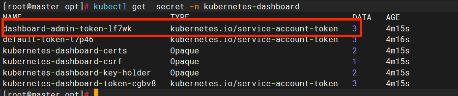 kebectl get secret -n kubernetes-dashboard